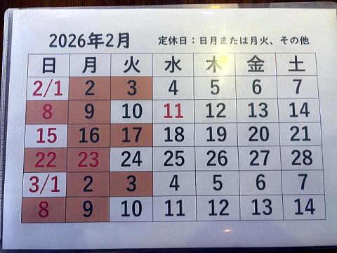 2月の営業カレンダーは下記の通りです